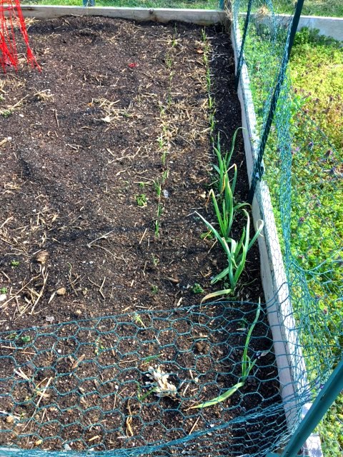 The plot pictured above has garlic, onions, and more. The gardener laid some straw to help protect the bulbs this time of year. [Straw vs hay? Straw is dried stalks of a plant, no seeds. Hay contains seeds which could take over your plot. Always use straw and leave the hay for the horses.]